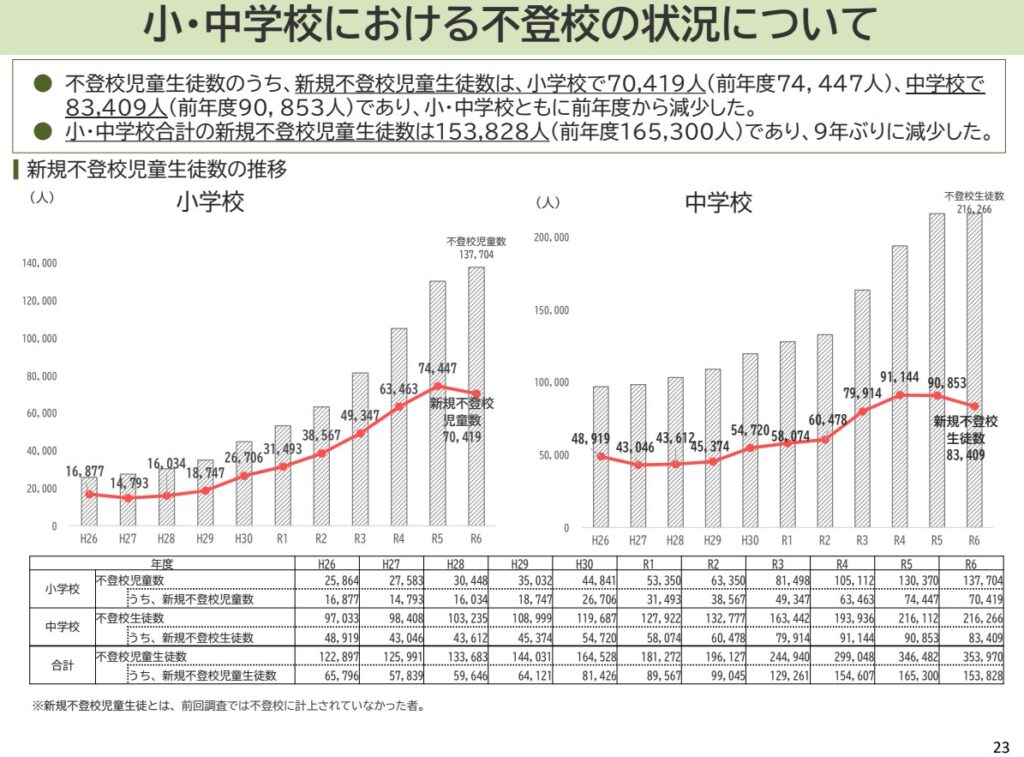 さて、その観点から文部科学省のデータを改めて読み直してみますと、重要な課題も見えてきます。添付の図(スライド23)は、文部科学省の資料で、R6年度は小学校、中学校ともに、「新規不登校児童生徒数」が減少したことが指摘されています。