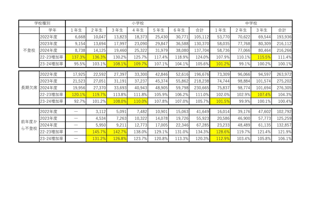 上の表は、不登校の子どもの各学年の数と増加率を示しています。黄色カ所は、増加率の高いところで、小学校は2学年分、中学校1学年分塗っています。2022-2023年度は、小学校では1,2年生、中学校では3年生で、2023-2024年度は、小学校では3,4年生、中学校では1年生となってなっており、年度によって学年が動いています。