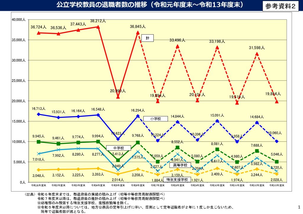 このデータが物語っていることは、2032年度までは退職年齢の順次引き上げに伴い教員総数が増加する(退職しない)ということです。61歳までの延長時には、1年ぐらいであればということで、ある一定数の先生が早期退職されましたが、これからは本格的に退職年齢の引き上げの影響が学校現場に出てきます。