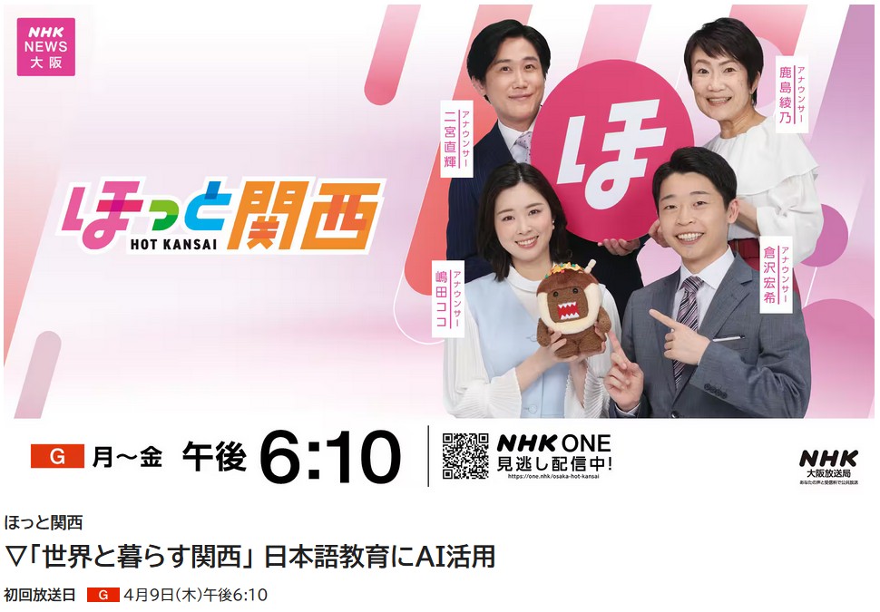 3月18日(水)NHK京都において放送された、外国ルーツの子どものための「リアルタイム多言語翻訳システムの開発」のテレビ放送が、今回は関西地域向けに放送されます。