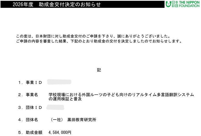 一般社団法人黒田教育研究所より「学校現場における外国ルーツの子ども向けのリアルタイム多言語翻訳システムの運用検証と普及」のテーマで2026年度日本財団の助成金に申請を行ったところ、このたび、助成金交付が決定しました。「①事業目的」と「②期待される波及効果」は下記のとおりです。